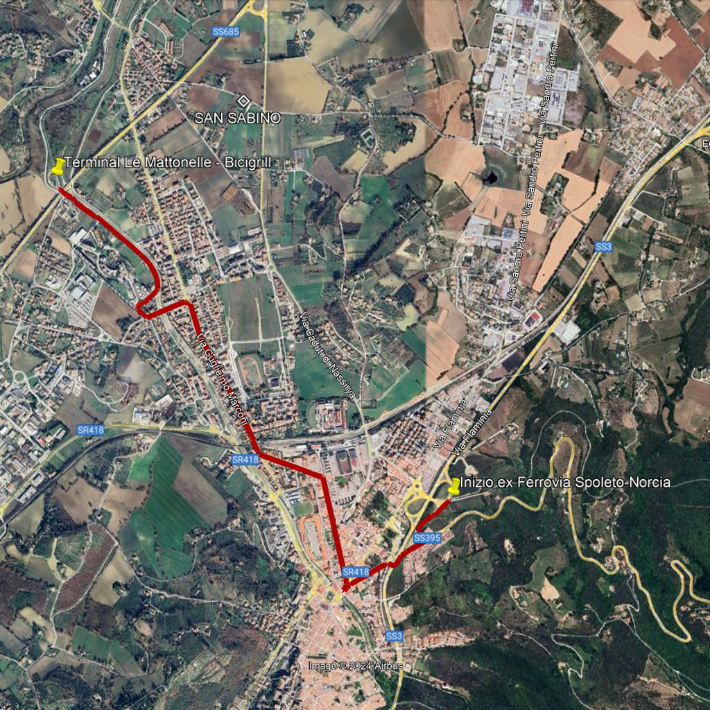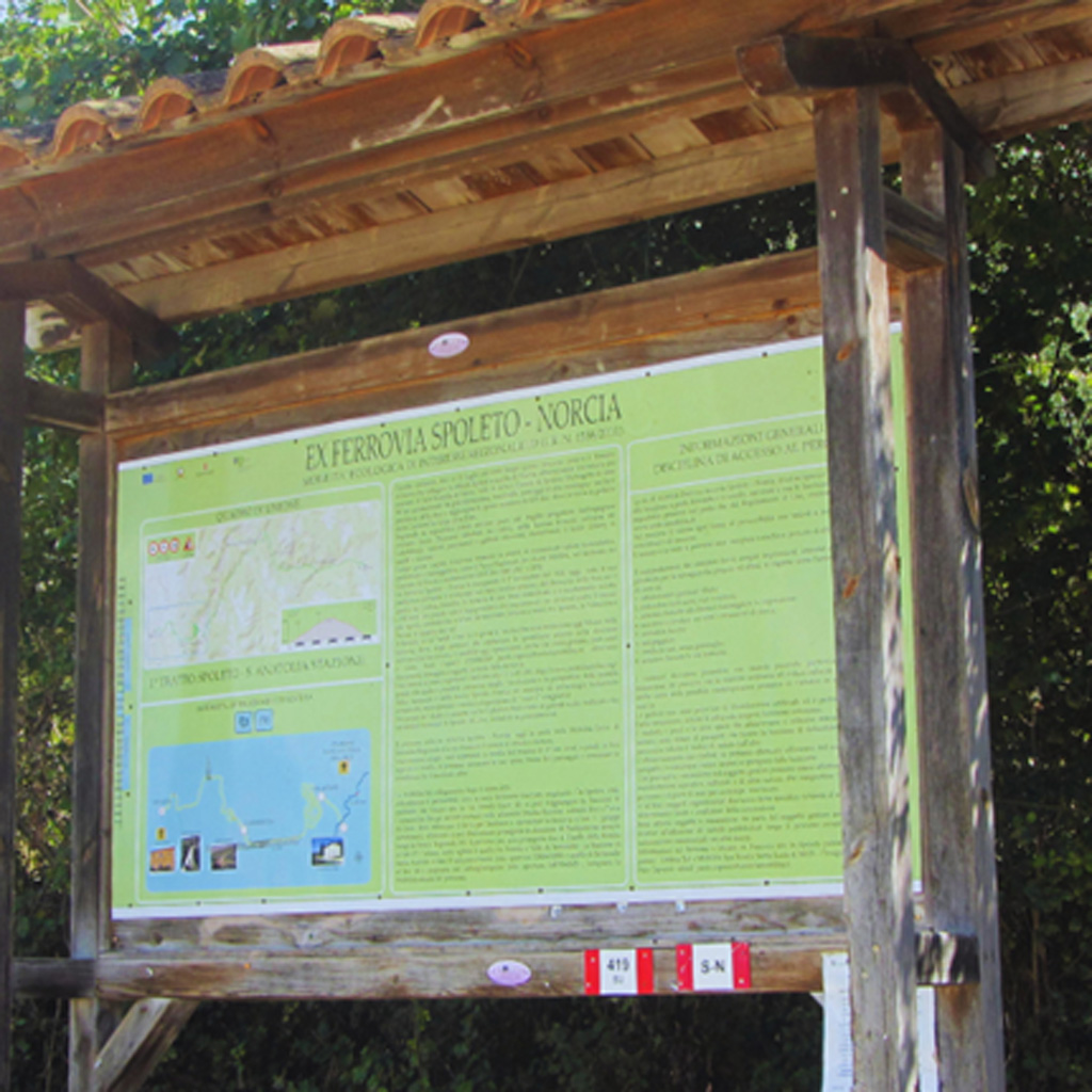 Il percorso culmina all’ingresso della pista ciclabile Spoleto-Norcia, che attraversa i pittoreschi borghi di Sant’Anatolia di Narco, Piedipaterno, Borgo Cerreto, Triponzo e arriva fino a Norcia, attraversando la suggestiva Valle del Corno.