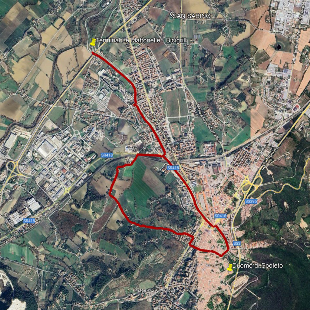 Il percorso che dal Terminal Le Mattonelle conduce al centro urbano di Spoleto, si inserisce nel più ampio progetto della pista ciclabile Spoleto-Assisi, una delle più lunghe d’Europa con i suoi 50 km, attraversando 8 comuni umbri: Spoleto, Campello sul Clitunno, Trevi, Montefalco, Bevagna, Foligno, Cannara e Assisi. Il Terminal Le Mattonelle, situato tra le frazioni di Pontebari e San Nicolò a Spoleto, è un punto strategico della rete ciclabile. Questo ex complesso industriale di fine ‘800 è stato rinnovato come centro di servizi per i ciclisti e punto di assistenza alla ciclabile stessa.