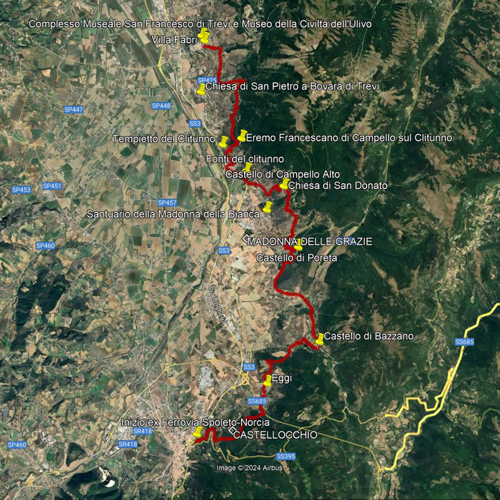 Costeggiando il castello, il sentiero scende fino a raggiungere l’ex strada statale 3, oggi nota come via Fonti del Clitunno. Da questo punto, si ha l’opportunità di visitare il Tempietto sul Clitunno, una piccola chiesa a forma di tempietto corinzio, inserita dal 2011 nella lista dei patrimoni dell’umanità dell’UNESCO. Proseguendo lungo il sentiero, si sale verso l’Eremo Francescano e la chiesa di San Michele Arcangelo, il punto più alto della tappa, situato a 562 metri di quota. Da qui inizia una discesa dolce che porta gli escursionisti a Trevi, attraversando un tratto che sovrasta l’antico acquedotto medievale.